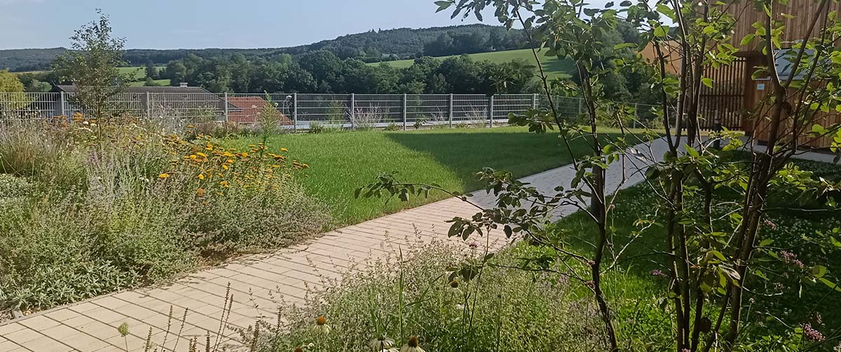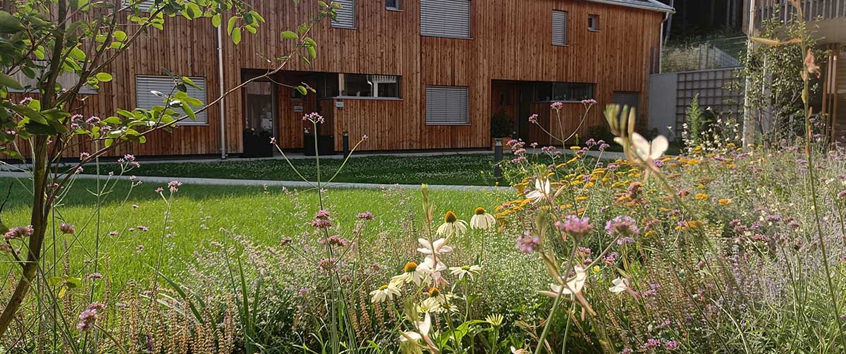 Im hinteren Teil des Grundstückes befindet sich ein weitläufiges Areal mit Streuobstwiese, ökologisch wertvoller Langgraswiese und vielen heimischen Sträuchern, die Unterschlüpfe, Brut- und Nahrungsstädten für zahlreiche Insekten, Vögel und Tiere aus dem angrenzenden Wald bieten. Hier können auch interne Workshops sowie Workshops für Kinder zum Erforschen und Begreifen der Natur, stattfinden.