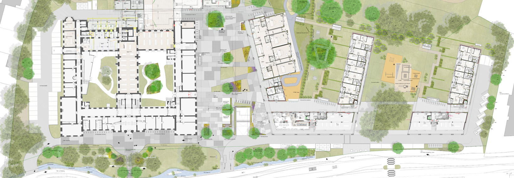 Die rund 20.400m² großen Freianlagen reagieren auf diese vielfältigen neuen Nutzungsanforderungen: Neben privaten Gartenbereiche finden sich auch halböffentliche und öffentliche Freiräume. Die Schule bekommt eigene Sport- und Bewegungsflächen, die nicht öffentlich zugänglich sind und auch der Kindergarten freut sich über seinen eigenen Gartenbereich. Ein kleines Highlight ist der renaturierte Gersbach. Die Rückführung aus dem Betongerinne in einen naturnahen Bachlauf wertet den Campus ökologische und gestalterische auf.