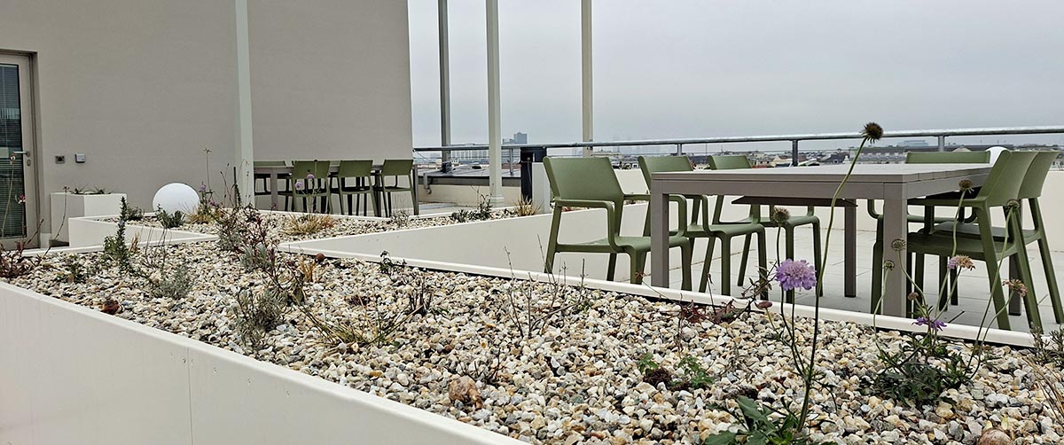 Die Gründächer sind zentraler Bestandteil der thermischen Sanierung und nachhaltigen Gebäudeaufwertung. Sie verbessern das Mikroklima, reduzieren Hitzeeinträge und verlängern die Lebensdauer der Dachabdichtung. Gleichzeitig senken sie Energie- und Erhaltungskosten, optimieren den Regenwasserrückhalt und steigern sowohl den Immobilienwert als auch die Aufenthaltsqualität in den darunterliegenden Innenräumen. Durch die Kombination mit Photovoltaikanlagen wird die Flächeneffizienz maximiert: erneuerbare Energie wird direkt am Standort erzeugt, während die Vegetation durch Verdunstung die Kühlung der Module unterstützt und so ein höherer Energieertrag erzielt wird.