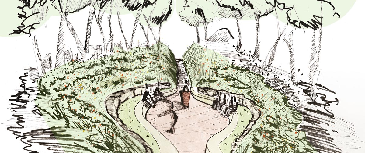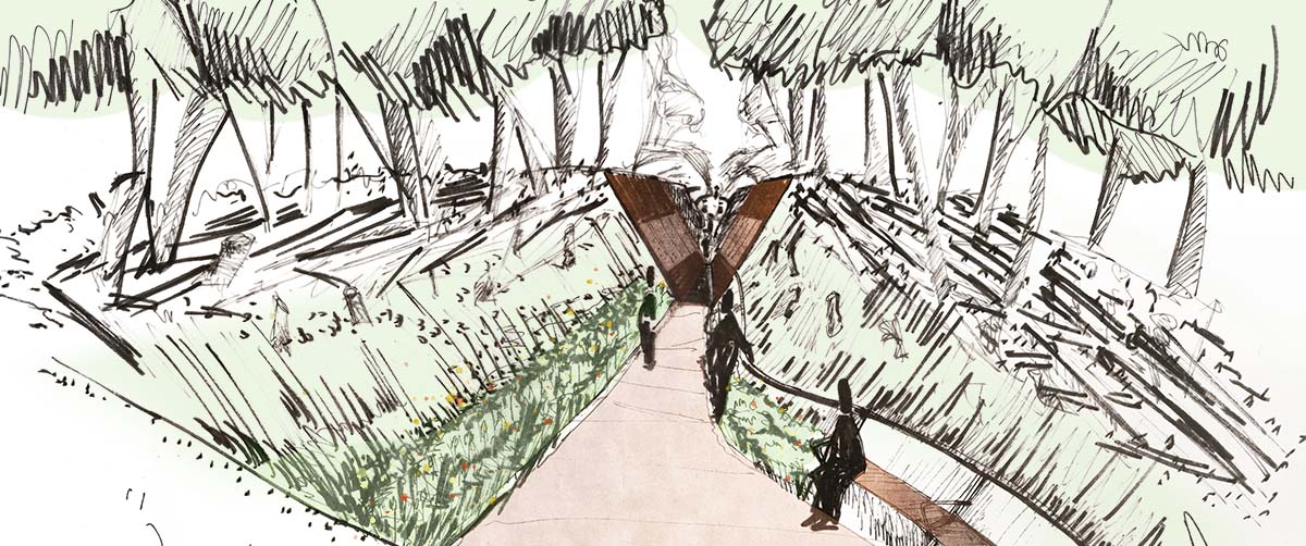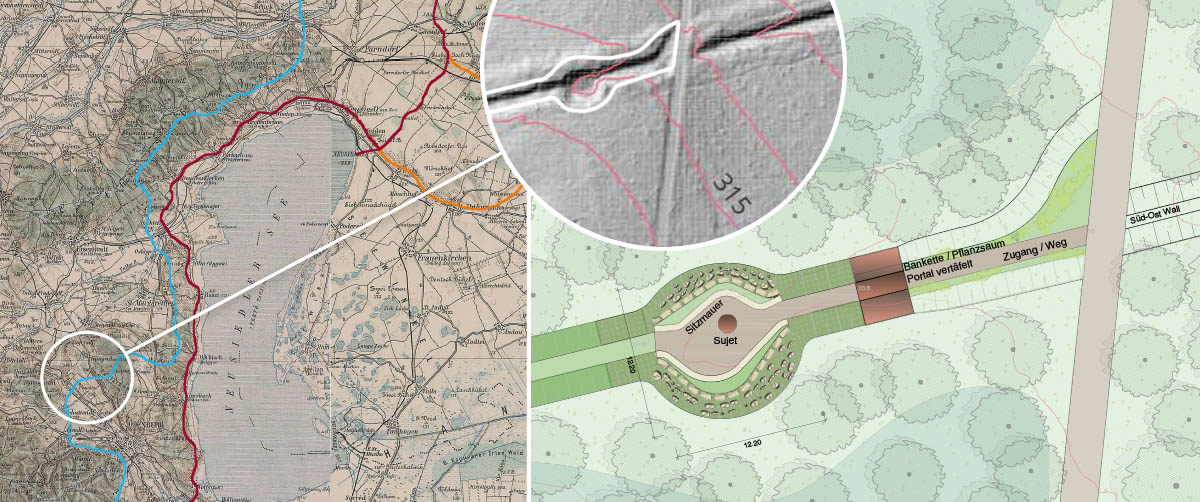 Misrachi Österreich hatte die Idee an diesem Ort eine Gedenkstätte für die Verschleppten am Südostwall errichten. Zusammen mit novetus – Archäologische Grabungen und historische Baumsubstanz sowie P&R – Büro für Erlebnisentwicklung haben wir ein Konzept für eine gedenkstätte und Vermittlungsort entworfen, der den historischen Ort respektiert und gleichzeitig Möglichkeiten zum Innehalten, Gedenken, Vermitteln und Aufarbeiten bietet. Der Zugangsbereich der Gedenkstätte ist in seiner Gestaltung reduziert gehalten. Informationen zu den Opfern, dem Ort und den Tätern stehen den Besucher:innen zur Verfügung bevor sie über ein, sich verengendes, Portal zum eigentlichen Erinnerungsort gelangen. Hier öffnet sich der Raum und bietet Sitzmöglichkeiten zur Andacht oder Gedenkveranstaltungen. Gedenktafeln aus Sandstein – in Anlehnung an jüdische Grabsteine – säumen die Sitzreihen und den dahinterliegenden Wall. Ein dezentes Bepflanzungskonzept unterstreicht den natürlichen Charakter des Waldes und strahlt Ruhe aus.