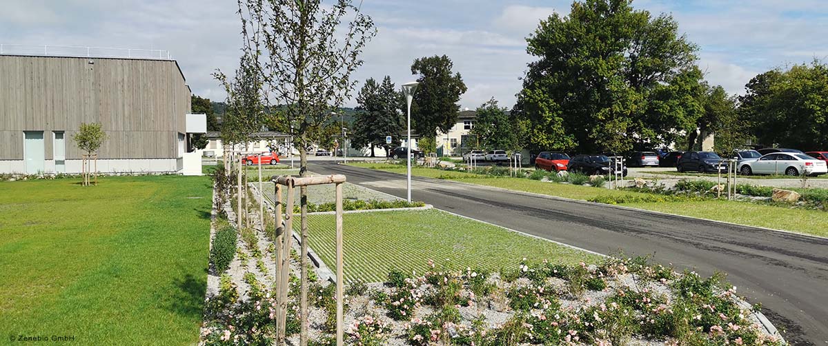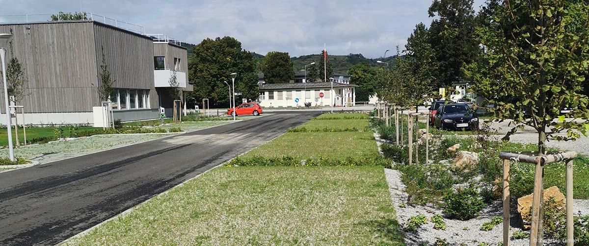 Besondere Aufmerksamkeit galt der Ausgestaltung der Stellplätze. Diese wurden als Schotterrasenflächen und begrünte Rasenliner ausgeführt und ermöglichen eine hohe Versickerungsleistung. Ergänzende Sickerbeete nehmen zusätzlich anfallendes Niederschlagswasser auf. Das speziell entwickeltes Substratsystem DrainGarden®, auf Basis natürlicher Rohstoffe sorgt dafür, dass große Wassermengen rasch aufgenommen und zwischengespeichert werden, anstatt unmittelbar in die Kanalisation abgeleitet zu werden. Wie leistungsfähig dieses System ist, zeigte sich im September 2024: Außergewöhnlich hohe Niederschlagsmengen von rund 300–350 l/m² führten vielerorts zu massiven Überflutungen und zur Überlastung des Kanalnetzes. Der klimafitte Parkplatz des Gemeindezentrums hingegen bewältigte die Wassermassen dank seines durchdachten Regenwassermanagements problemlos. Flächige Gehölzpflanzungen, pflegeleichte Blütenstauden und Ziergräser unterstützen nach Regenereignissen die „Entleerung“ der gespeicherten Wassermengen durch Verdunstung und Pflanzenaufnahme. Klimabäume sorgen zusätzlich für beschattete Stellplätze und eine spürbar kühlere Umgebungsluft in den Sommermonaten.