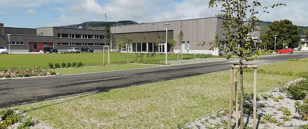 Das Gemeindezentrum wurde gemeinsam mit seinen klimafitten Freiräumen mit dem klimaaktiv Gold Standard ausgezeichnet. Ausschlaggebend waren unter anderem der zukunftsfitte Parkplatz, versickerungsfähige Wege- und Platzflächen mit Sickerfugenpflaster, artenreiche Stauden-Sickerbeete, die großzügige Veranstaltungswiese sowie der gezielte Einsatz von Schattenbäumen.