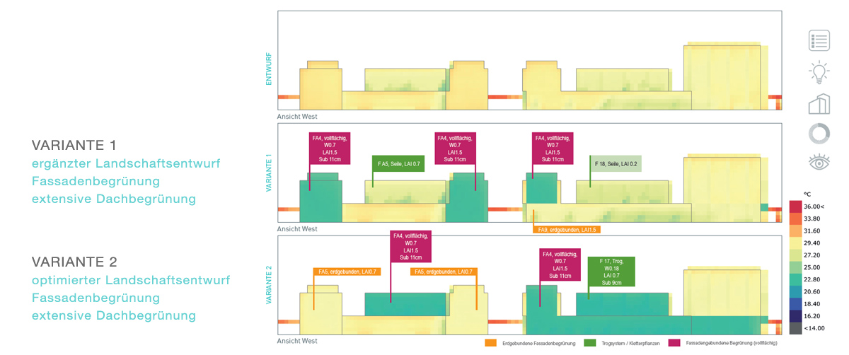 Zur Analyse der Auswirkungen unterschiedlicher Begrünungsstrategien wurden umfangreiche mikroklimatische Simulationen durchgeführt. Mithilfe spezialisierter Modellierungswerkzeuge konnte untersucht werden, wie sich verschiedene Formen der Dach- und Fassadenbegrünung auf die Temperaturentwicklung im Quartier auswirken. Auf dieser Grundlage wurden Hitzehotspots identifiziert und Optimierungsvarianten für Begrünungsmaßnahmen entwickelt.