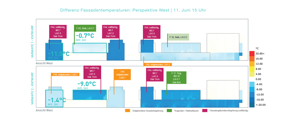 Die Ergebnisse zeigen deutlich, dass Vegetation einen wichtigen Beitrag zur Verbesserung des Stadtklimas leisten kann. Begrünte Fassaden und Dächer reduzieren Oberflächentemperaturen, erhöhen die Verdunstungskühlung und verbessern damit sowohl das Mikroklima im Außenraum als auch die thermischen Bedingungen in Gebäuden.