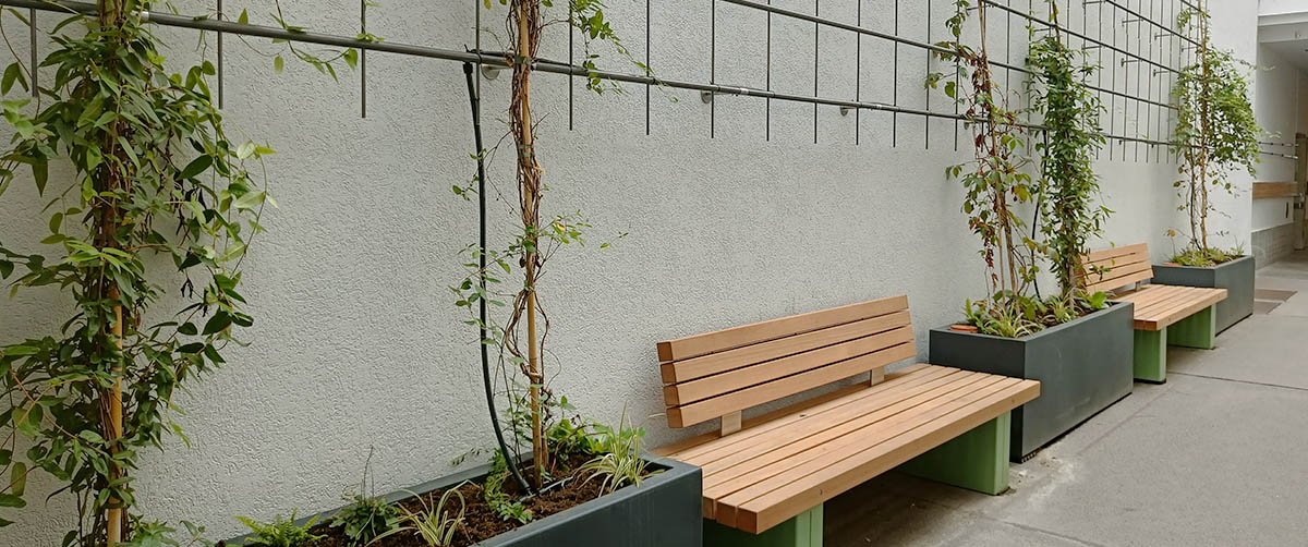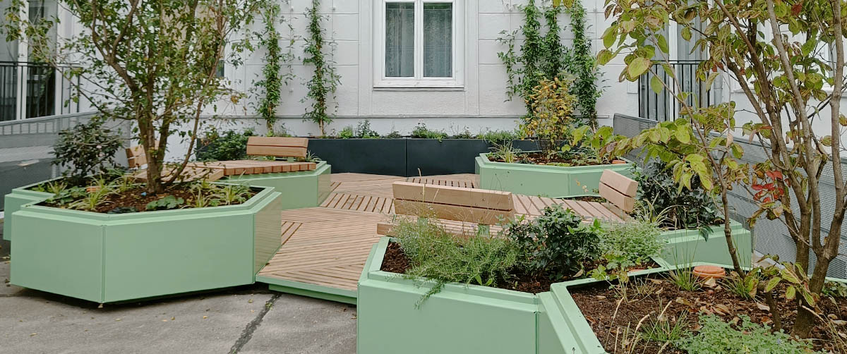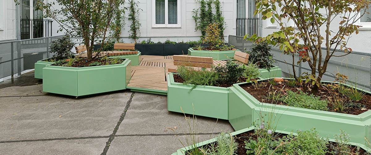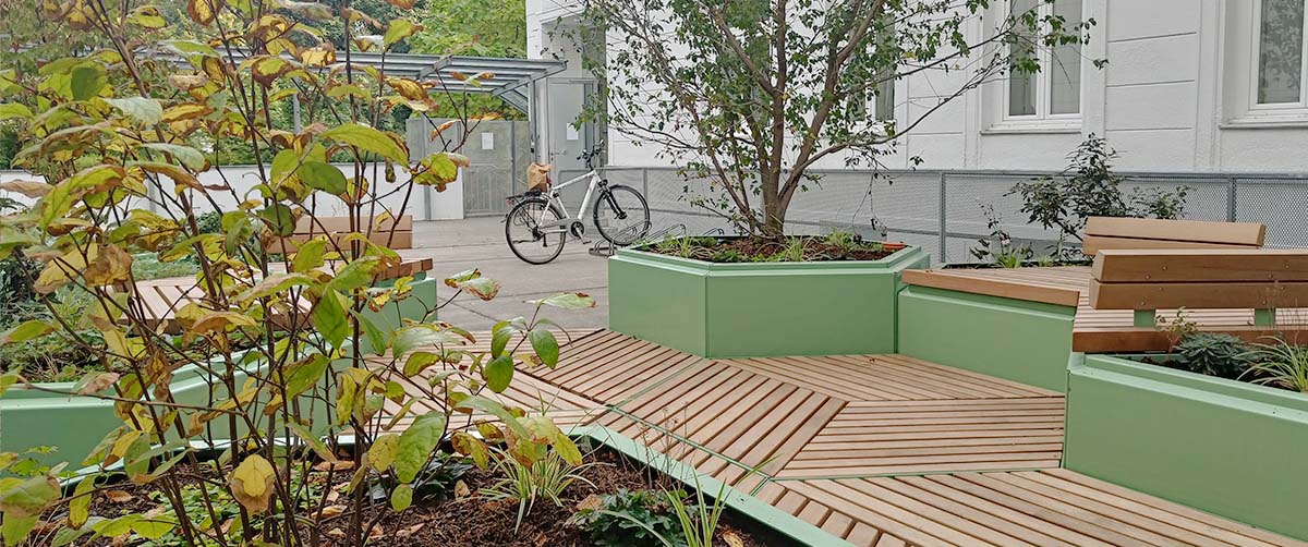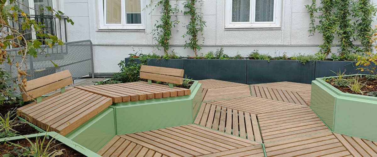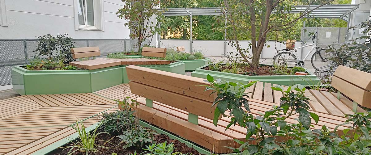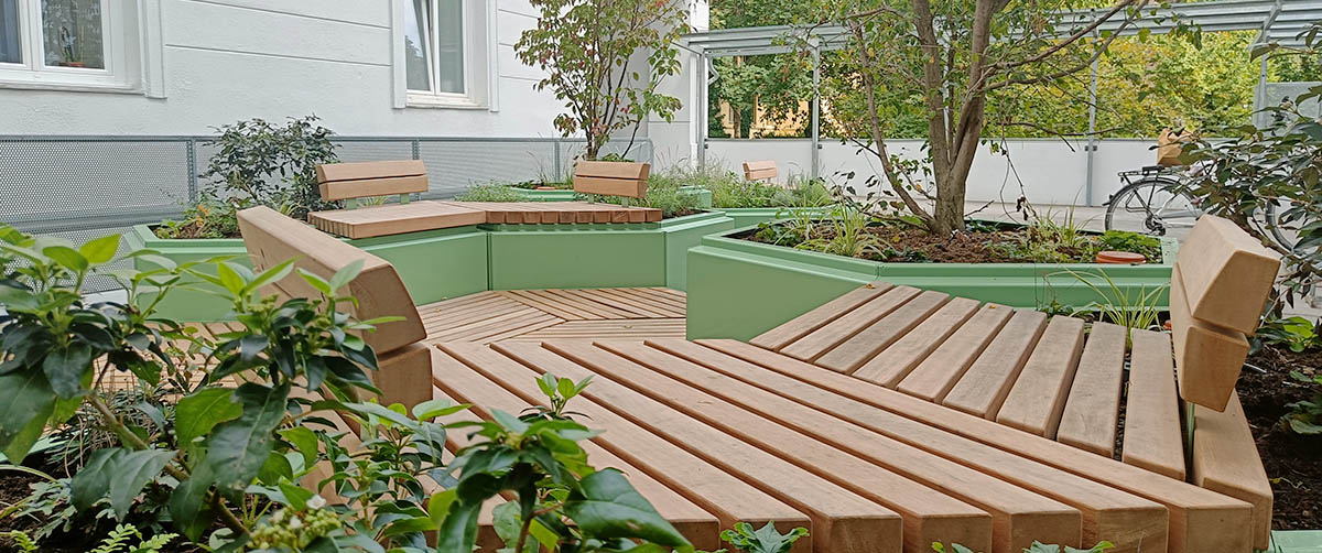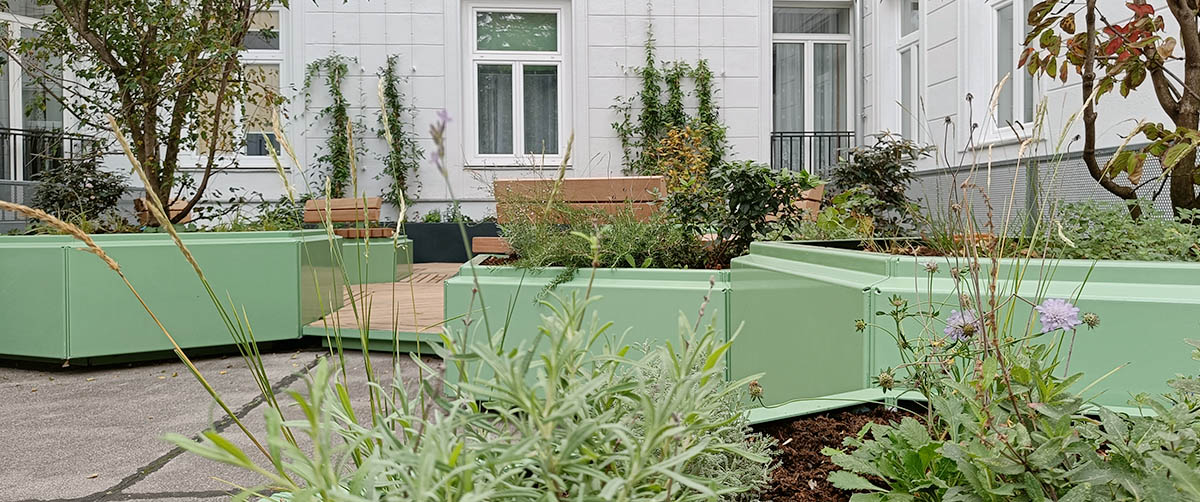 Die drei aufeinanderfolgenden Innenhöfe des Wohnhauses in der Mariahilfer Straße werden für die MieterInnen als „grüne Wohnzimmer“ neu gestaltet. Die Innenhöfe sind unterkellert, weshalb wir uns für eine Bepflanzung in verschieden hohen, bunten Trögen entschieden, um eine maximale Begrünunbg zu ermöglichen. Die üppig blühenden Staudenbeete tauchen die Höfe in sanfte Farben, die Ruhe und Entspannung signalisieren. Holzdecks mit Loungemöbel laden zum verweilen ein. Unterschiedlich große Sträucher bilden zusätzliche Tiefenwirkung und schaffen schattige Akzente. Die Bepflanzung erfolgt nach dem „Vivaldi Prinzip“ in ganzjähriger Farbenpracht mit edel, gediegenen Farben mit creme-rosa-violetten Akzenten, die auch aus den Wohnungen für eine schöne Aussicht sorgen. Immergrüne Gehölze geben Strukturen auch im Winter. Kletterpflanzen an der Fassade lassen den Grünraum vertikal weiterwachsen. Die Pflanzenwahl erfolgt zudem standortspezifisch und klimaresilient. So entsteht ein kühlender und attraktiver Innenhof für die BewohnerInnen, der auch an heißen Sommertagen für einen angenehmen Aufenthalt im Freien sorgt.