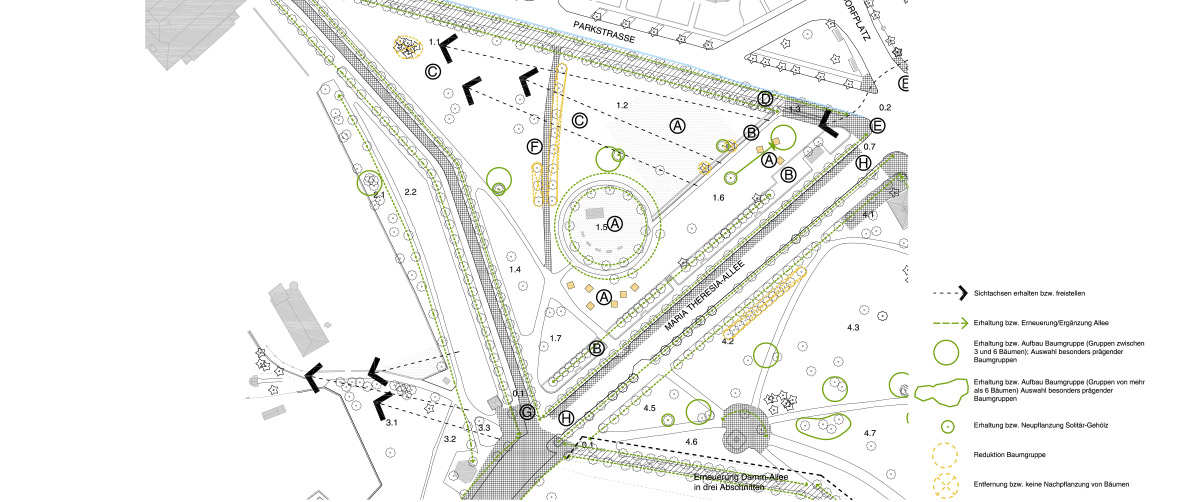Ausgehend von diesen Marauschek-Plänen wurden nach eingehender Analyse des Stadtparks, Leitbilder für die unterschiedlichen Fachgebiete (Naturschutz, Denkmalschutz, Freiraumgestaltung) und die Bereiche des Stadtparks definiert. Durch genaue Darlegung von bestimmten (Vegetations-) Strukturen, die sich heute im Park noch sehr gut ablesen lassen, in den nächsten Jahrzehnten jedoch altersbedingt verschwunden sein könnten (beispielsweise die Clumps, Baumgruppen mit Bäumen derselben Art), soll die Charakteristik des ursprünglichen Stadtparks erhalten bzw. wieder stärker herausgearbeitet werden. Dies muss zudem in enger Abstimmung mit den naturschutzfachlichen Vorgaben und den heute gänzlich anderen Nutzungsansprüchen der StadtbewohnerInnen einhergehen.