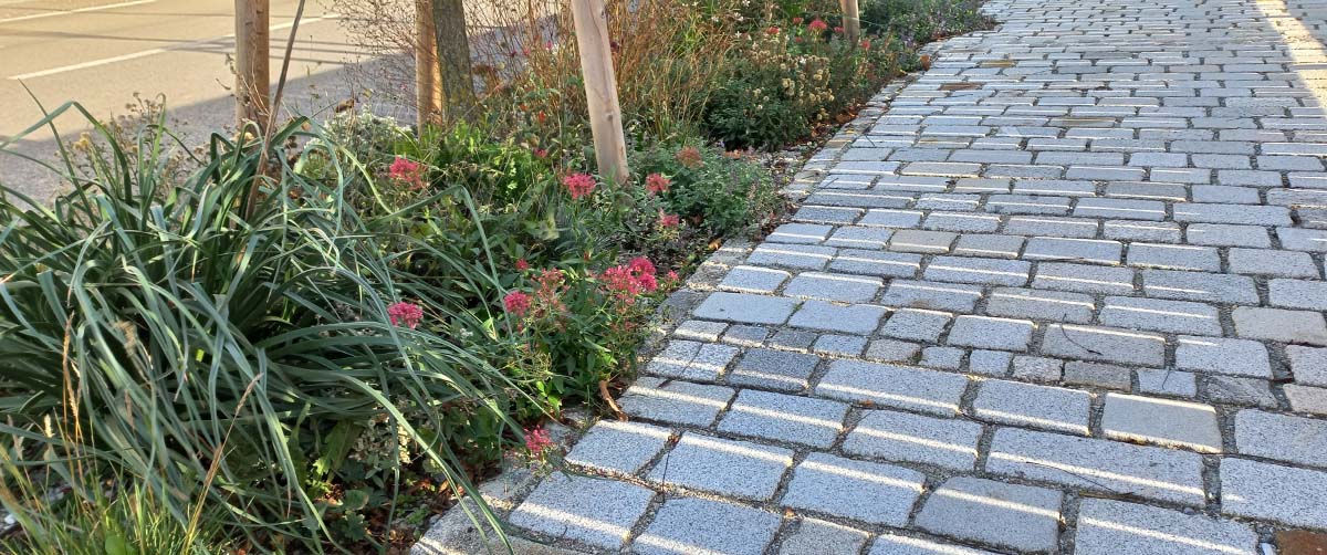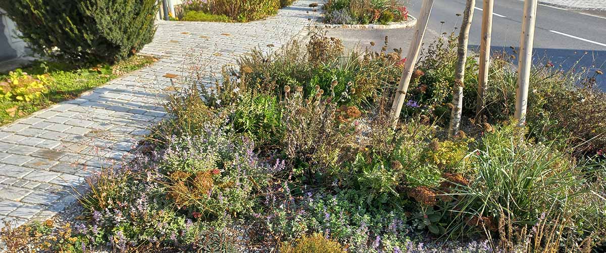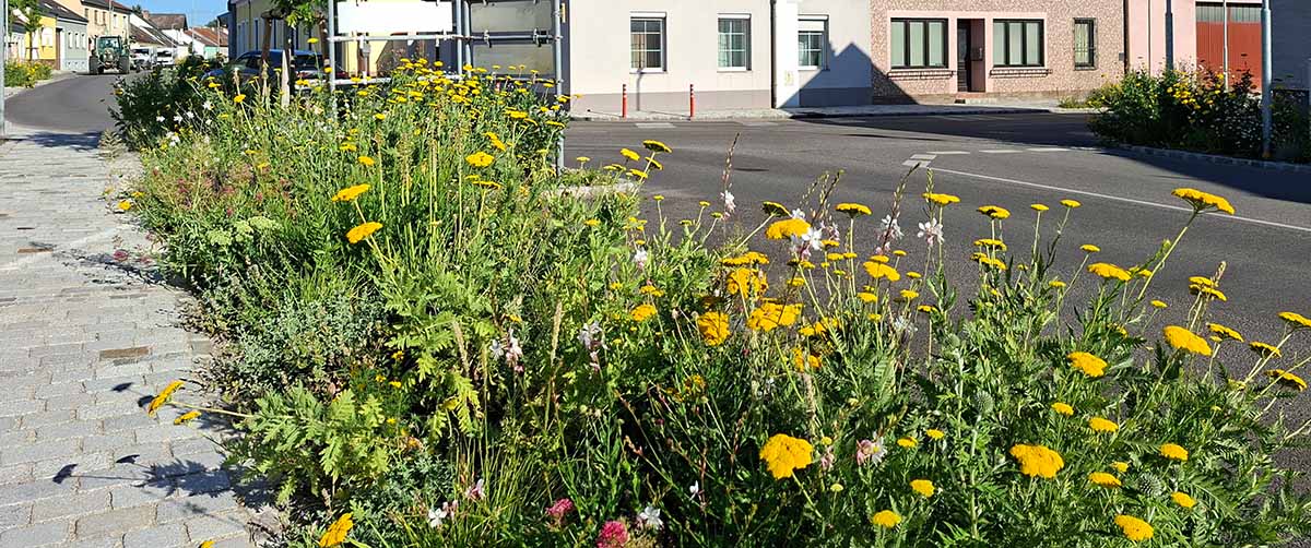Die Gestaltung der multifunktionalen Verkehrsfläche mit hochwertigen Pflasterungen aus Naturstein bildet ein verbindendes und charakteristisches Merkmal. Gepflasterte Gehsteige in ungebundener Bauweise ermöglichen lokale Regenwasserversickerung und tragen zur Verbesserung des örtlichen Mikroklimas bei. Die neuen Baumscheiben beschatten die gepflasterten Bereiche und sind dauerhaft mit extensiven Staudenmischungen bepflanzt. Die entstandenen Grünflächen sind mit trockenheitsverträglichen Gräser-Staudenmischung bewachsen, unter die sich auch ein paar duftende Blütenstauden mischen. Weitere Grünflächen sind als pflegeextensive und artenreiche Blumenwiese angelegt. Durch Aufweitungen wie z.B. beim Friseur entstanden Orte der Kommunikation und ein Straßenzug wurde ein zentraler Aufenthaltsraum für die Menschen der Marktgemeinde.