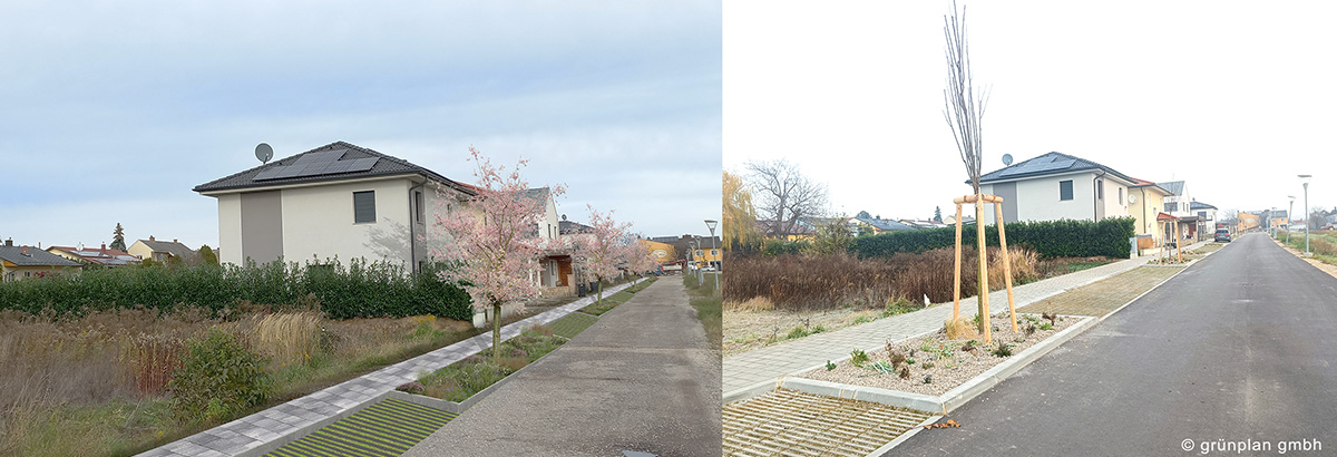 Visualisierungen künftiger Gestaltungsprojekte schaffen Klarheit und sind ein wichtiger Bestandteil zur Ideenvermittlung. Im Partizipationsprozess eines Siedlungsentwicklungsprojektes in Pillichsdorf konnte die Visualisierung des künftigen Straßenzuges neben GemeindevertreterInnen auch die BürgerInnen überzeugen. Die klimafitten Staudenmischpflanzungen mit schattenspendenden Gehölzen und die dazwischenliegenden Stellplätze mit hoher Versickerungsfähigkeit wurden diesen November fertiggestellt.