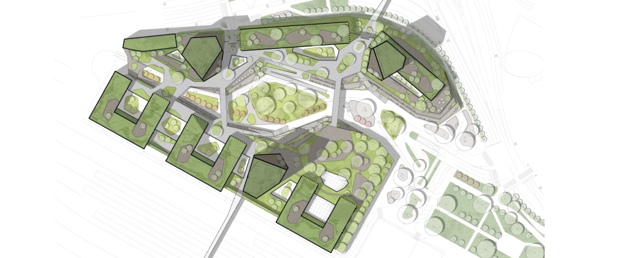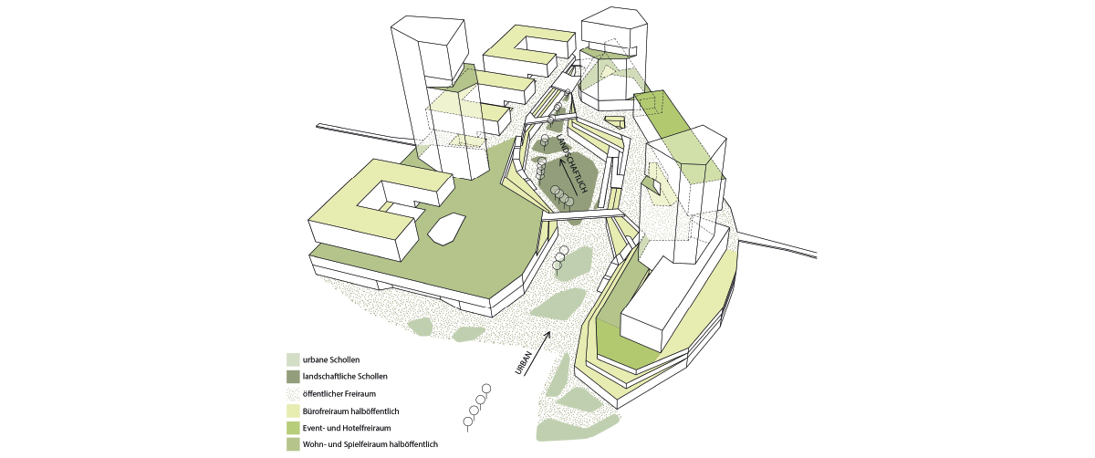 Die Formensprache der Architektur wird auf den Freiraum übertragen. Grüne Schollen mit unterschiedlichen Aufenthaltsqualitäten machen ihn erlebbar. Richtung Bahnhofsvorplatz öffnet sich das Quartier und leitet die unterschiedlichen NutzerInnengruppen über schattenspendende Bäume in den hybriden, städtischen Freiraum. Dem neuen Einkaufszentrum vorgelagert, lädt der urbane Platz zu unterschiedlichen Veranstaltungen und Treffpunkte ein. Herzstück des Quartiers bildet der zentrale, konsumfreie Park, welcher unter dem großen Blätterdach zum Verweilen einlädt. Leicht abgesenkte Bereiche bilden bei Regenfällen Retentionsflächen, welche ansonsten unterschiedlichste, auch aneigenbare Nutzungen ermöglichen. Vom urbanen, aktiven Bereich im Norden verdichten sich die Schollen in den grüneren und ruhigeren Bereich im Süden. Die Schollen weiten sich immer wieder zu kleinen Plätzen auf, um geschäftsbezoge Freiräume zu bespielen und attraktivieren. Das grüne Rückgrat bildet die blühende Kirschenallee, welche sich über den Bahnhofsvorplatz durch das Quartier führt.
