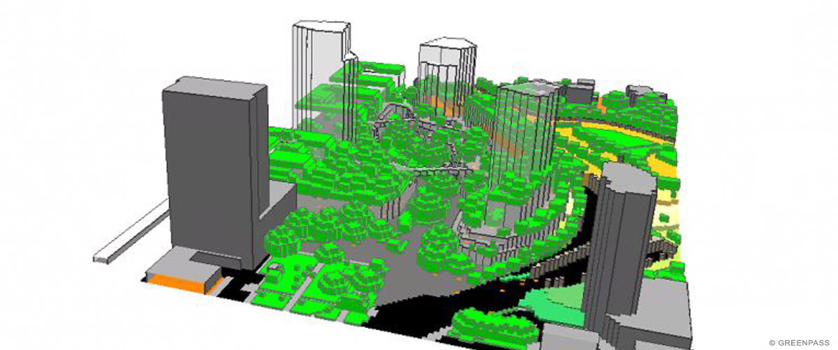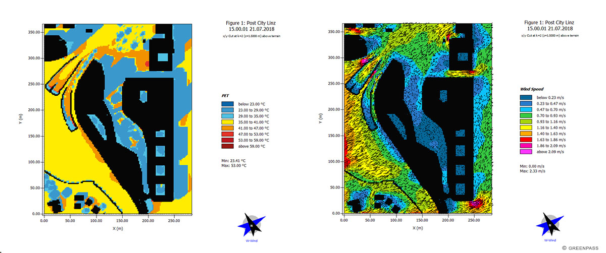 Über die Auswertung einer Mikroklimasimulation lässt sich aufzeigen, dass die Gebäudestellung und der üppig grüne Freiraum sowohl die Temperatur als auch die WIndgeschwindigkeit im Quartier senkt.