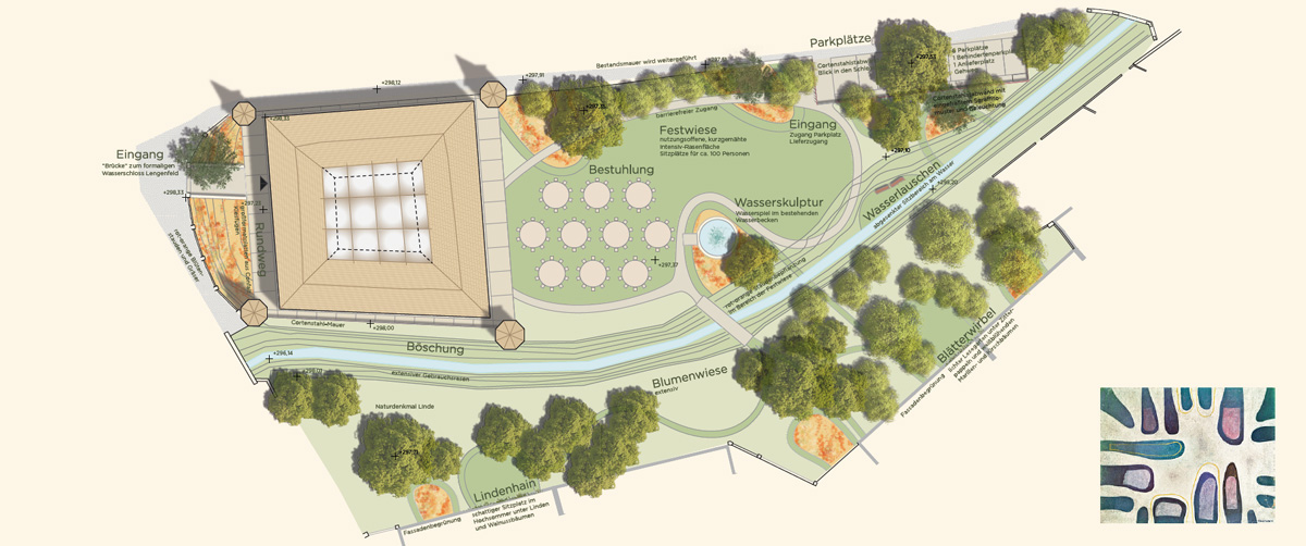 Das Freiraumkonzept beruht auf den Bild- und Linienkompositionen von Johann Fruhmann. Blühende Staudenbeete, Sitzbereiche und die Wegeführung nehmen die Formen- und Farbsprache des Künstlers auf und lassen Fruhmanns Bilder lebendig werden. Das Schloss selbst wird vorsichtig von umgebenden Bodenablagerungen und Aufschüttungen befreit und so in seiner ursprünglichen Wirkung wieder erfahrbar. Um diese Wirkung noch zu verstärken wird es von einem Rundweg aus Confalt-Großformatplatten mit breiten Kiesfugen sowie einem Traufstreifen (verdunstungsoffen) umsäumt. In unmittelbarer Umgebung des Schlosses und nördlich des Baches wird eine intensive Landschaft vorgeschlagen. Eine große Rasenfläche, umsäumt von mehreren blühenden Staudenbeeten, bietet einen nutzungsoffenen Raum für Feste und Veranstaltungen. Eine filigrane Brücke führt über den Bach in den naturnahen und pflegeextensiven Bereich des Gartens. Rasenwege durchschneiden die blühende Blumenwiese mit Obstbäumen und führen zu idyllischen Sitzplätzen. Der den Garten durchziehende Spazierweg führt die BesucherInnen zum Bach und zum Sitzplatz „WasserLauschen“. Die in diesem Bereich abgeflachte Uferböschung dient gleichzeitig als Retentionsraum bei Hochwasser. Ebenso wird bei der dezenten Geländemodellierung auf mögliche Hochwassersituationen Rücksicht genommen. Das neue Wasserspiel mit „Jumping Jets“ im Brunnen (bestehendes Swimmingpool) bringt einen zusätzlichen belebenden Aspekt in den Garten.