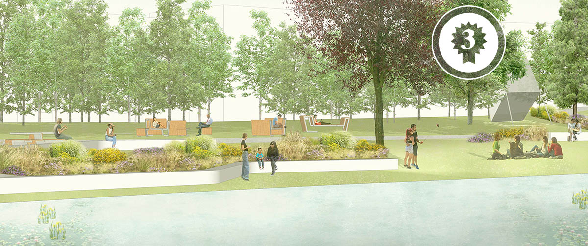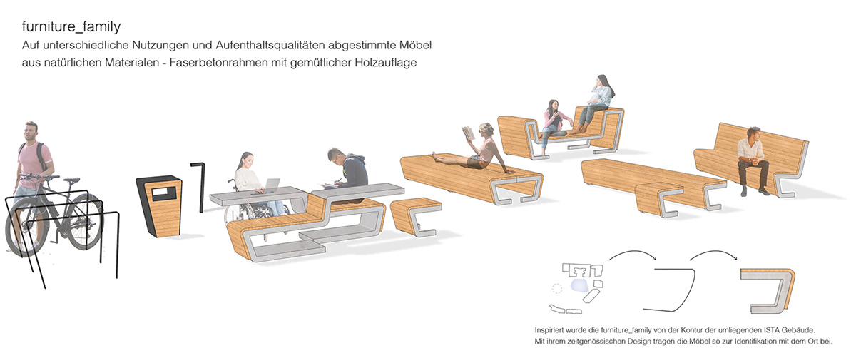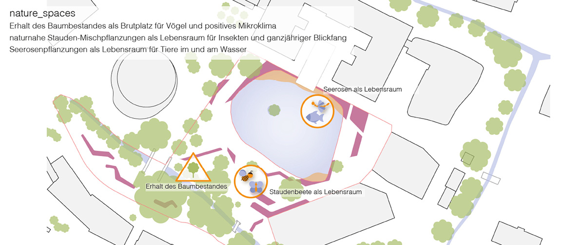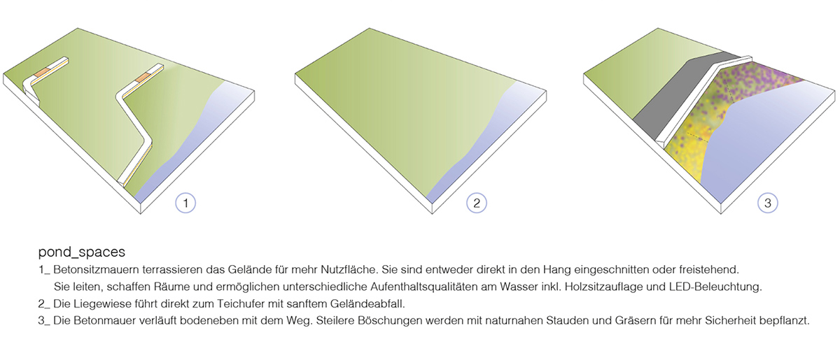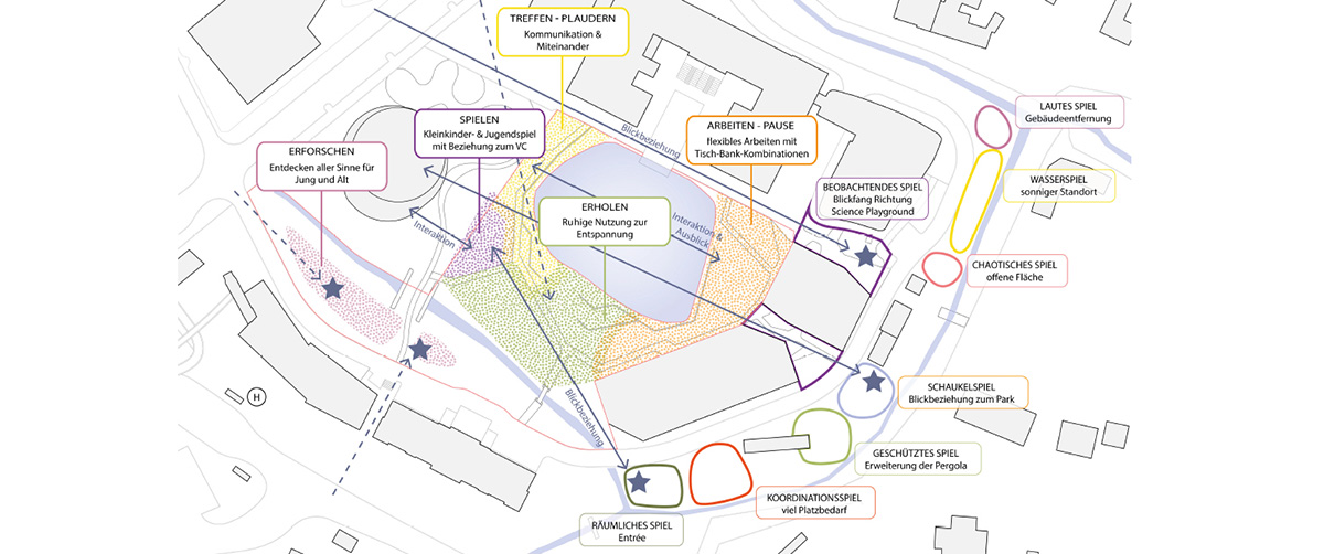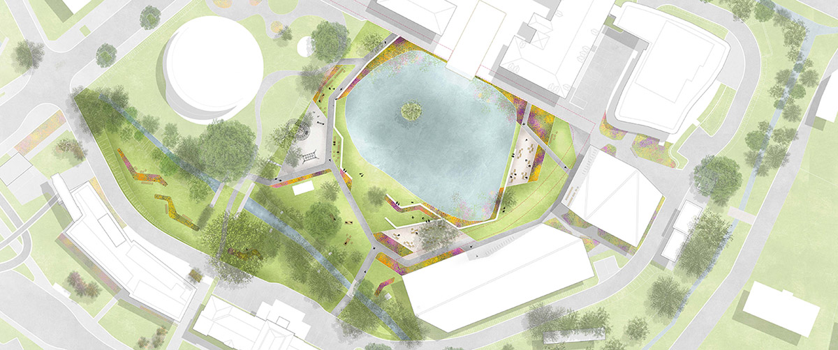 bindet diesen durch attraktive Freiräume ein. Der neue Wegering führt durch die einzelnen Raumsequenzen um den Teich, verbindet diese und ermöglicht jedem der umliegenden Büro- sowie Laborgebäude den Einstieg. Ihm erschließen sich neue Angebote und Funktionen in Form von offenen, platzartigen Aufweitungen an: Der Spielplatz an der Böschung verbindet das Visitor Center mit dem Campuspark. Die Outdoor-Bereiche vor den Forschungsgebäuden ermöglichen mit unterschiedlichen Tisch-Bank-Kombinationen Arbeitsplätze alleine oder in Gruppen. Zusätzlich bilden Sitzbetonmauern als linearhafte Strukturen raumgliedernde Elemente, welche zur spontanen Aneignung, alleine oder gemeinsam, einladen. Sie fangen Höhenunterschiede auf und ermöglichen so eine größere nutzbare Rasenfläche zum Picknicken oder Entspannen in Ufernähe. Die raumgliedernde Wirkung wird durch ökologisch wertvolle Staudenbeete unterstützt. Diese bieten zudem ganzjährige, farbenfrohe Blickfänge.